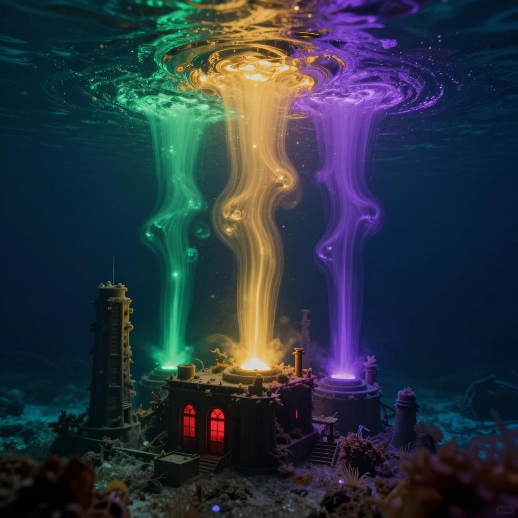 Photorealistic image of an underwater abandoned city illuminated by vibrant retro art light pillars in emerald green, gold, and royal purple hues. The scene features a submerged structure with glowing red windows and neon-like swirling lights rising towards the water surface, creating a cinematic and mystical atmosphere.