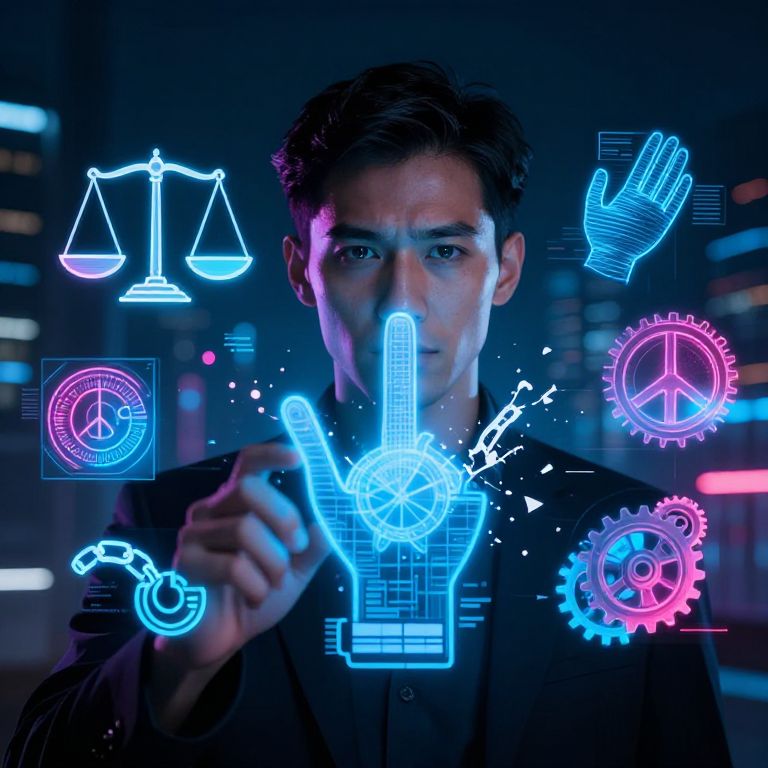 Photograph of a middle-aged man with short dark hair and blue eyes, wearing a black shirt, standing in a dark, neon-lit cityscape. His right hand points forward, and holographic blue icons surround him: a balance scale, hand, peace symbol, gear, chain, and circular lock. The neon lights cast a purple and blue glow on his face and the background, creating a futuristic, cybernetic atmosphere. The holograms and city lights enhance the technological, high-tech feel of the image.