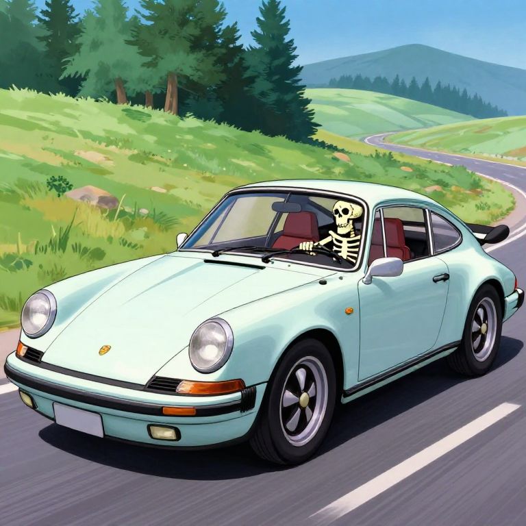 Bump Mapping 1930 era of Skeleton cartoon driving a porsche 930 , Art in the style of Max Fleischer, Painting, Colorful, anime, 8k, Smooth, Perfect Body,