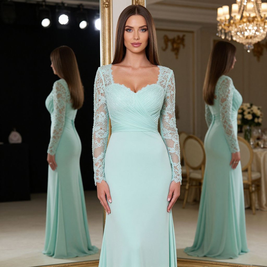 A high-resolution, realistic shot of a mint green wedding guest costume worn by a woman at a luxury ballroom wedding, the outfit is a midi-length, elegant mint green gown with a sweetheart neckline and lace sleeves, she is standing near a large mirror with soft stage lighting, featuring long straight hair and bright blue eyes. The woman has big breasts and cute face
