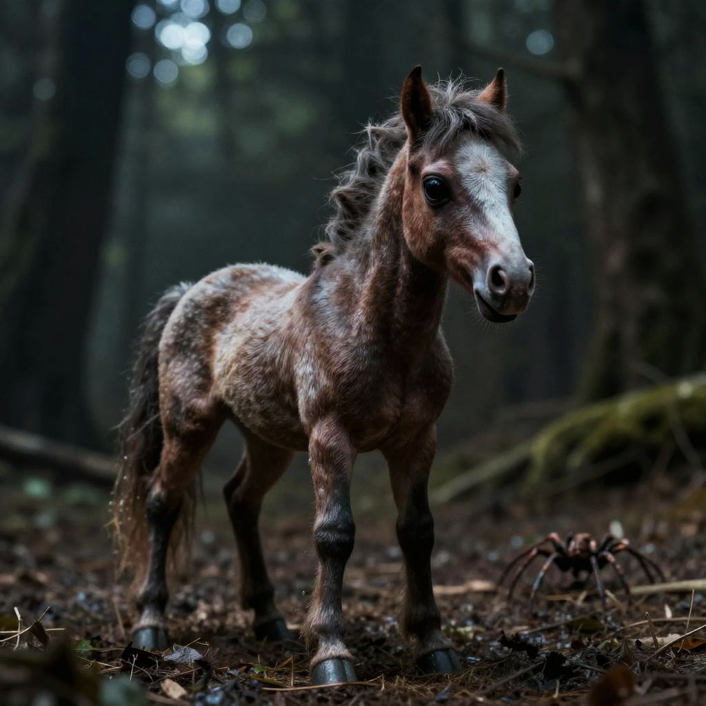 Photograph of a small, young horse standing in a dense, dark forest. The horse has a brown and white dappled coat with a slightly shaggy mane and tail. Its ears are perked up, and it gazes directly at the camera with a curious expression. The forest background is blurred, featuring tall trees with dark trunks and a forest floor covered in fallen leaves and twigs. The lighting is dim, with sunlight filtering through the trees, creating a moody, shadowy atmosphere. The horse's legs are slightly muddy, indicating it has been walking in the forest.