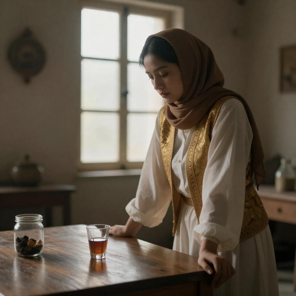 A young woman wearing a brown headscarf, white blouse, and intricately patterned gold vest leans on a wooden table in a dim, rustic room. On the table, there is a glass filled with a brown liquid and a clear jar containing small objects. A large window softly illuminates the scene from the background.