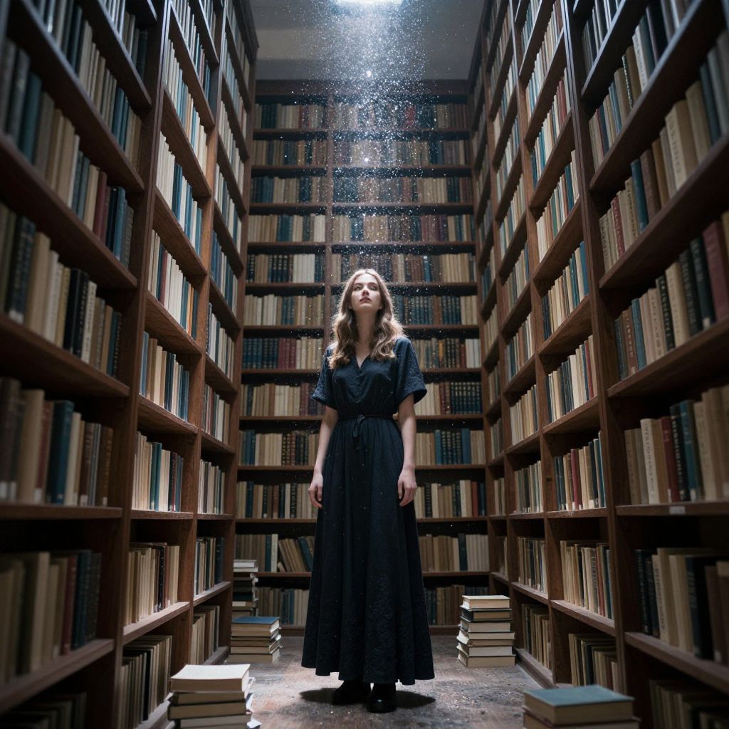 Mysterious woman in a dark dress stands amidst towering shelves of books, surrounded by cascading particles of light that float above her in a surreal, infinite library.
