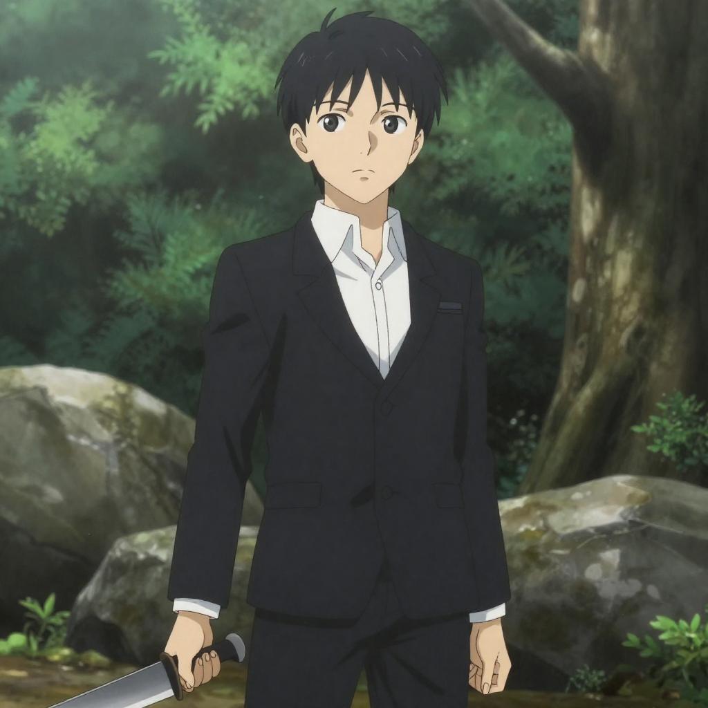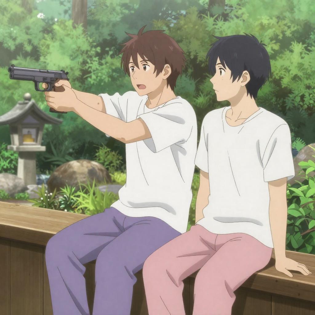 Anime-style group photo of seven characters standing in a traditional Japanese room. Each character has unique clothing and accessories: red hat with "X" and skull, black coat with chain, formal black suits, blonde girl with horned headgear, pink dress, and purple-striped shirt. Characters hold large rifles, standing in a line, facing forward. Warm, orange-lit background with wooden panels.