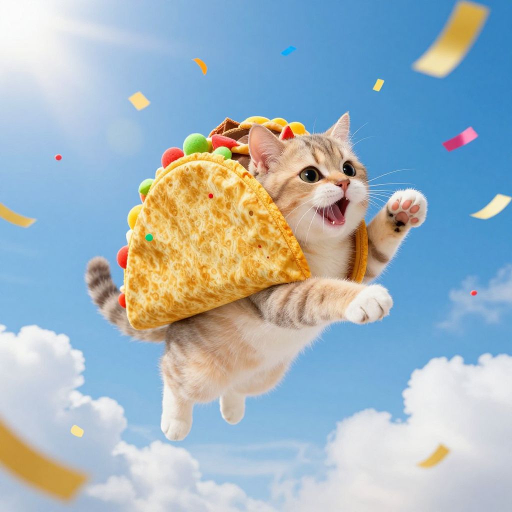 Cheerful cat in a taco costume jumping mid-air against a sunny blue sky with fluffy clouds, colorful confetti raining down, festive and joyful vibe, sharp details on fabric and fur, dynamic composition, vivid colors