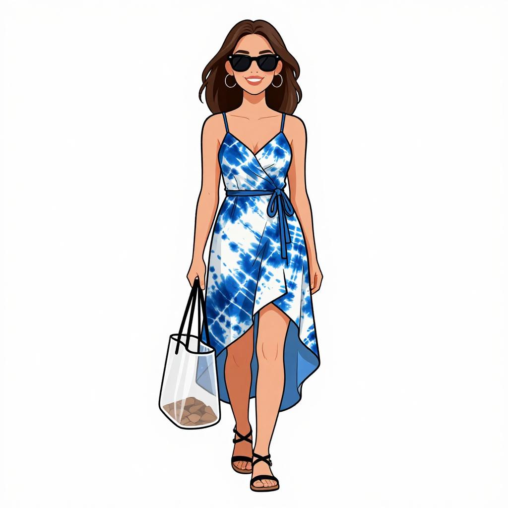 Woman with pretty face and pretty hair. smiling Woman, summer clothing, asymmetrical hem tunic dress in blue and white tie-dye pattern, spaghetti straps, high-low cut, ankle-length at longest point, paired with flat strappy black sandals, accessorized with oversized transparent tote bag, sunglasses. --sref 1467