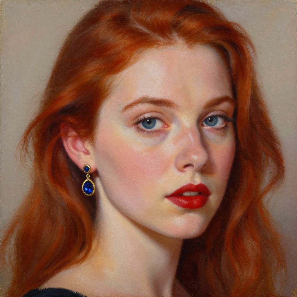 Malcolm Liepke's oil-on-canvas portrait captures a strikingly beautiful woman with vibrant red hair, adorned with a delicate gold earring featuring a blue gemstone, set against a soft, neutral background that highlights her vivid blue eyes and bold red lips.
