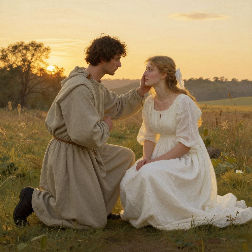 Photograph of a romantic sunset scene featuring a young man with curly brown hair, wearing a beige, medieval-style tunic and brown belt, kneeling on one knee, gently touching the chin of a young woman with blonde hair, adorned with a white flower. She sits on the grass, wearing a flowing, white, medieval-style dress. The golden sunset in the background casts a warm glow over the field and trees, creating a serene, picturesque atmosphere. The man's expression is tender, and the woman gazes up at him, appearing thoughtful. The image evokes a sense of timeless romance and connection.