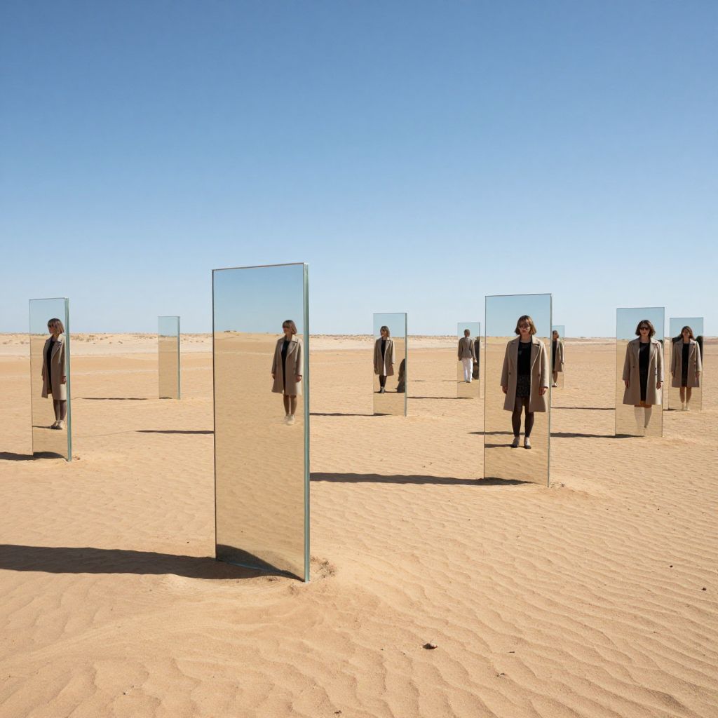 Deserted mirrors stand upright in a vast sandy expanse, each reflecting identical figures of a woman in a beige coat, creating an illusion of infinite repetition against a clear blue sky.