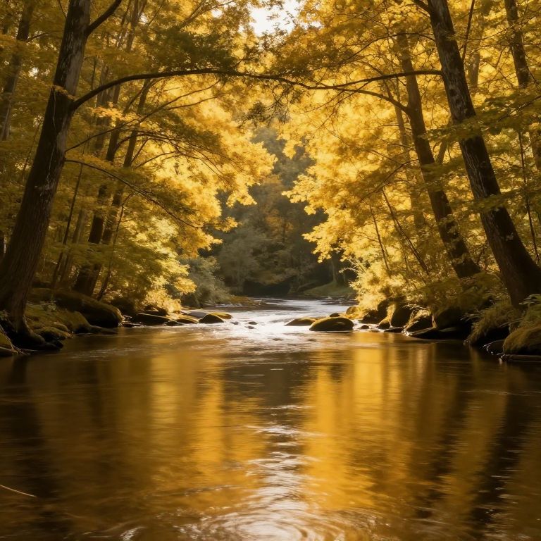 Photograph of a serene forest scene in autumn. Golden-yellow leaves from tall trees arch over a gentle, reflective stream, creating a natural canopy. Sunlight filters through the leaves, casting a warm, golden glow. The stream's surface mirrors the vibrant foliage and dappled sunlight. Rocky banks line both sides of the stream, and the background reveals a dense forest with a mix of yellow and green leaves. The overall mood is peaceful and picturesque, with the rich autumn colors and tranquil water adding to the scene's beauty.