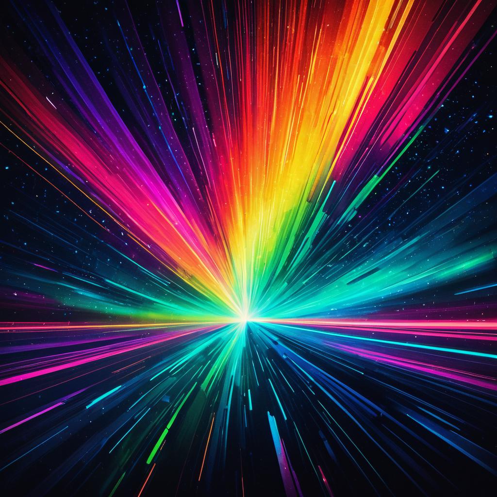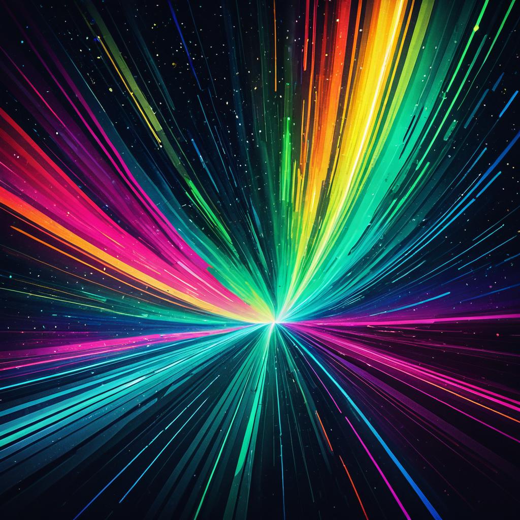 A vibrant and dynamic abstract digital artwork featuring colorful aurora light streaks radiating from the center. The composition uses dazzling, vivid tones including neon greens, blues, pinks, yellows, and oranges against a dark space-like background with subtle star-like dots. The image conveys a futuristic and energetic digital art style with professional lighting effects.
