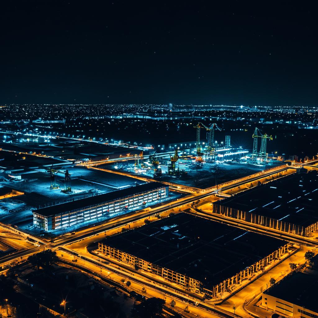 Hyper réaliste du photographe professionel, ultra photoreal, ultra-detailed, super detailed, full color, ambient occlusion, high contrast, HDR super detailed, 8k, vue haute de Ouagadougou la nuit panorama urbain eclairage LED vibrant sur grues de construction