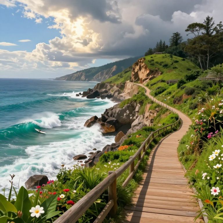 Surfway coastal pathway winding along cliffs with turquoise waters below, surfers riding big curling waves, dramatic clouds reflecting sunlight, lush greenery and blooming flowers along the trail, vibrant and detailed digital art style