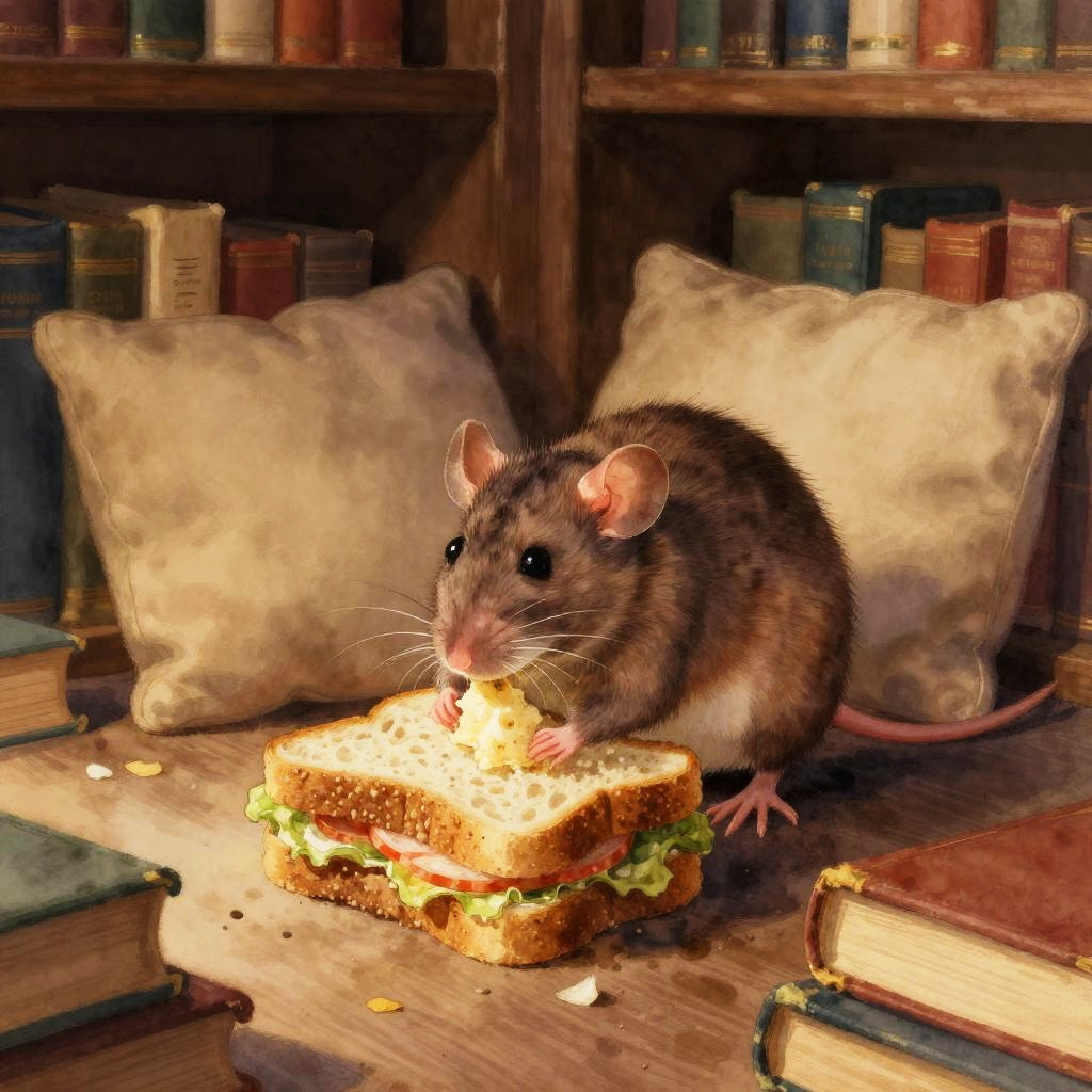 Whimsical scene of a rat eating sandwich on a picnic blanket in a sunlit meadow, bright and cheerful colors, detailed foliage and flowers, playful and cute illustration style, focus on sandwich layers and rat’s tiny paws, lively and joyful ambiance