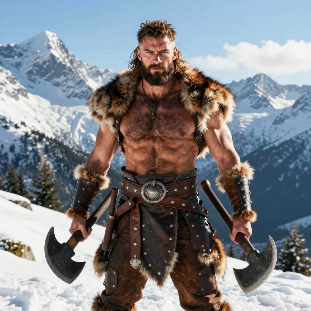 A muscular, bearded man with a fierce expression stands in a snowy mountain range. He's shirtless, wearing fur-trimmed leather armor, and holds two large axes. His chest is broad and hairy, and the sunlight highlights his muscular physique. The background features towering snow-covered peaks under a clear blue sky. The image has a dramatic, action-hero vibe.