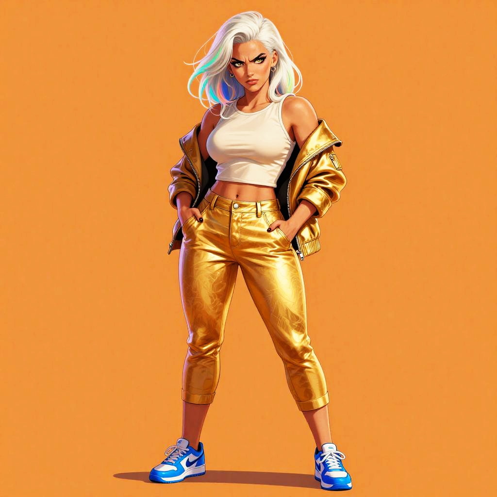 Illustration of a confident mature anime woman with platinum white medium-length hair featuring colored inner strands. She is wearing a golden off-shoulder jacket partially draped, a white cropped tank top, and shiny gold three-quarter pants. The character has an intense expression with a smirk and black fingernails, standing with hands in pockets against an orange background. She sports blue and white sneakers and has ear piercings, embodying a mix of muscular and wide-hipped physique.