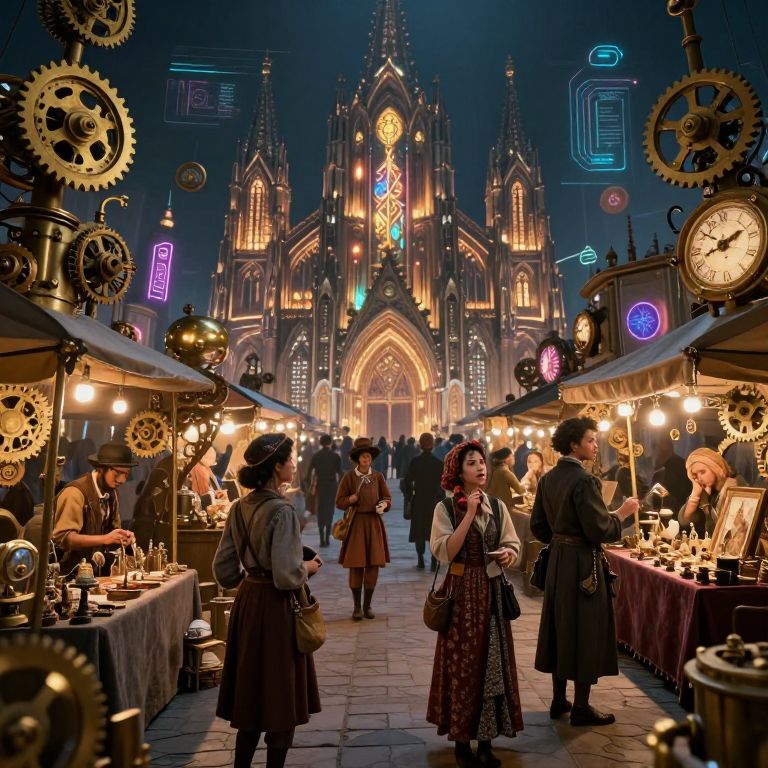 Craft an intricate digital art scene depicting a lively futuristic marketplace, reminiscent of steampunk aesthetics, as seen through a holographic display from a first-person viewpoint. This captivating environment combines Victorian-era technology with advanced gadgets, featuring harmonious integration of brass gears and clockwork mechanisms alongside neon lights and cybernetic enhancements. In the foreground, an eclectic assortment of characters representing various cultures can be observed engaged in spirited negotiations over intriguing merchandise, expressing a spectrum of emotions from enthusiasm to doubt while exploring this distinctive setting. The background showcases imposing edifices that echo Gothic cathedrals, constructed with metallic alloys and adorned with radiant, intricate patterns casting a warm glow upon the night sky.
