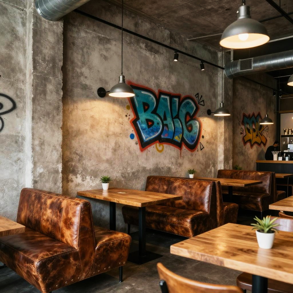 Industrial eclectic café scene with raw concrete walls, distressed leather seating, retro industrial lamps hanging from exposed ductwork, colorful graffiti art, and natural wood tables, capturing a cozy yet edgy vibe with ambient warm lighting.