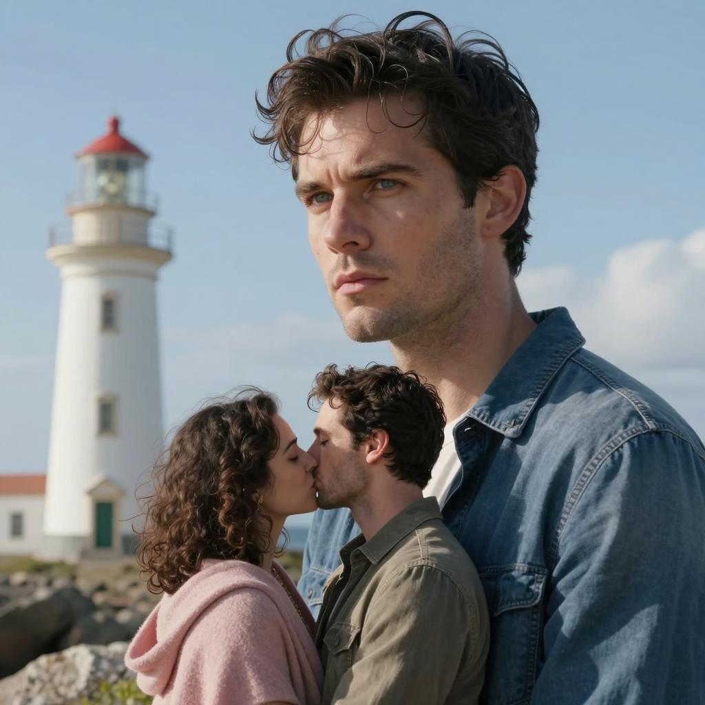 Photograph of a man with dark hair, blue eyes, and a serious expression, wearing a blue shirt. In the foreground, a smaller figure of a man with dark hair, kissing a woman with curly hair and pink shawl. Both smaller figures stand on a rocky cliff with a lighthouse in the background. Clear blue sky and clouds in the background.