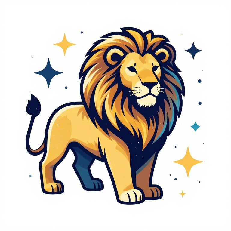 Full Shot beautiful zodiac symbol leo symbol lion, stars, flares, cold colors, whimsical style, vector digital painting, detailed white background,