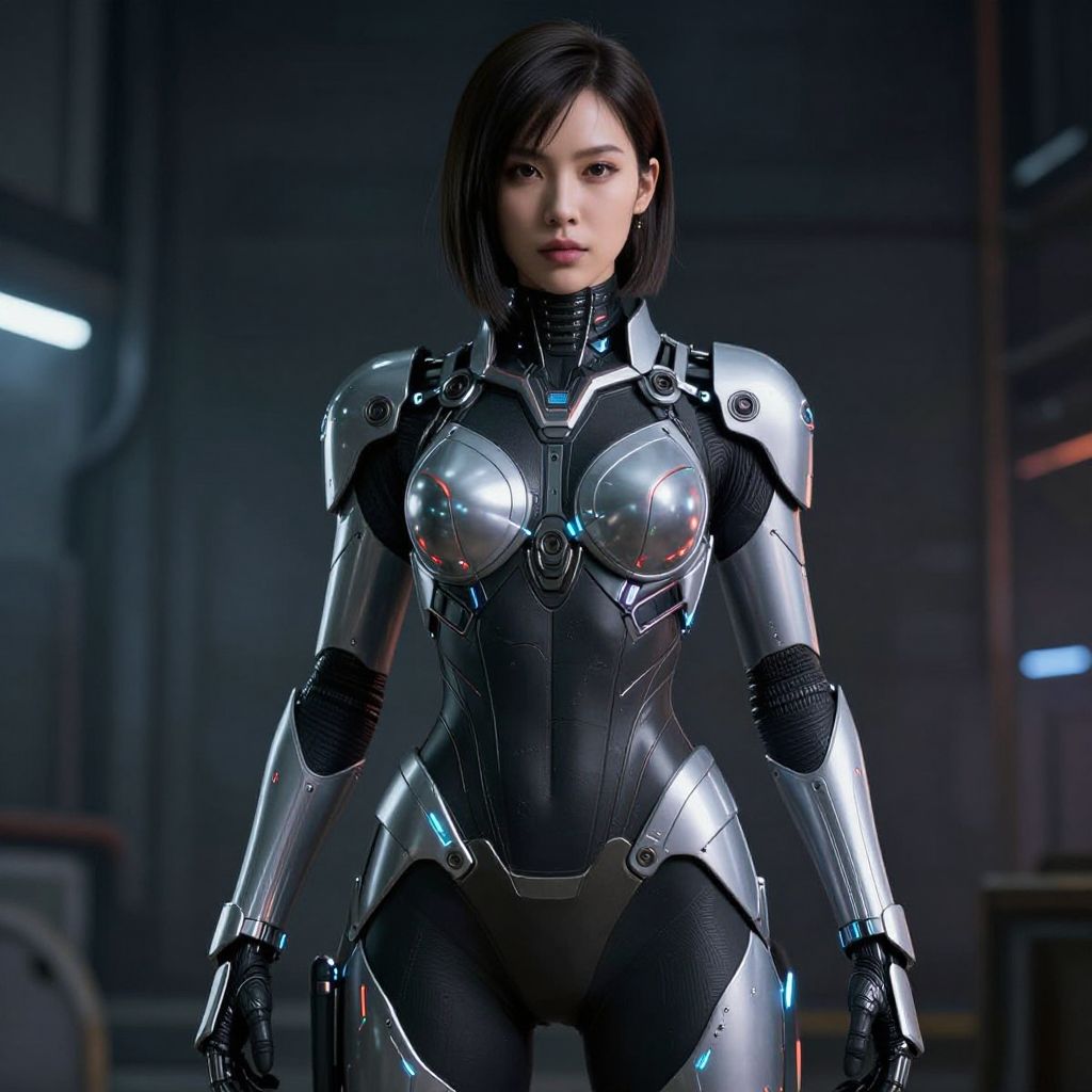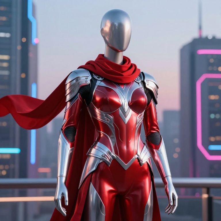 A detailed mannequin wearing a futuristic metallic armor suit with a vibrant red, blue, and silver color scheme, featuring intricate glowing patterns and reflective surfaces. The mannequin has a sleek, humanoid posture and stands confidently in front of a weathered, rusted fence made of iron bars, with a faintly illuminated backdrop suggesting a twilight urban environment. The mannequin wears a pair of wireless headphones on its head, which emit a soft, pulsating light, adding to the cyberpunk atmosphere. The scene is rendered in high detail with sharp contrasts, realistic textures, and a cool, moody lighting effect.