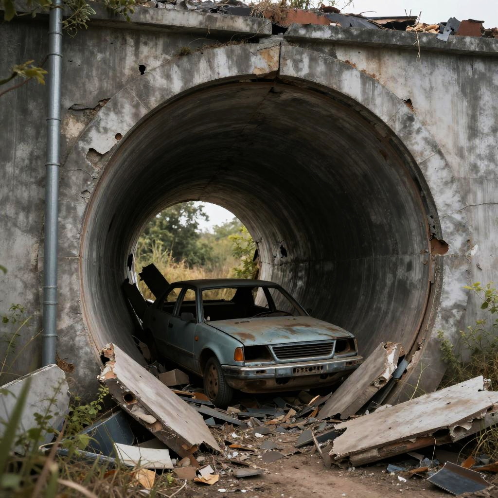 8k, realistic, vray, HDR, 6000K, on a post-apocalyptic collapsed tunnel, blocked entrance, abandoned car