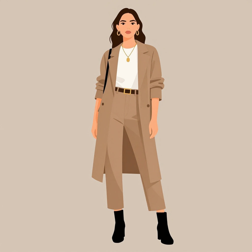 This illustration features a stylish woman dressed in a contemporary outfit, blending casual and formal elements with a light brown color palette. Her confident posture and fashionable attire reflect a modern, urban aesthetic, perfect for showcasing trends in lifestyle and fashion.