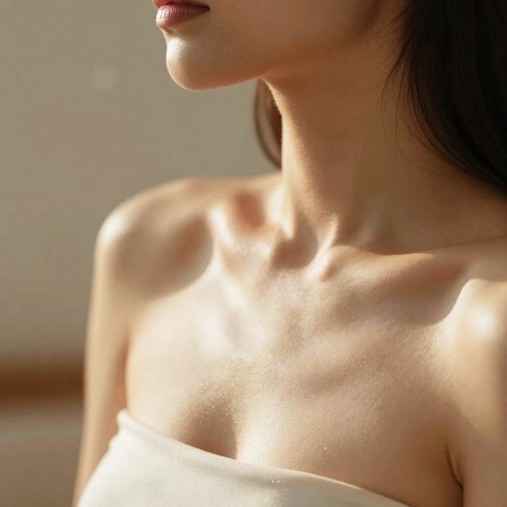 Collarbones gracefully outlined under soft natural light, highlighting delicate skin texture and subtle shadows, set against a minimalistic background with warm tones and gentle bokeh to create an intimate, serene portrait.