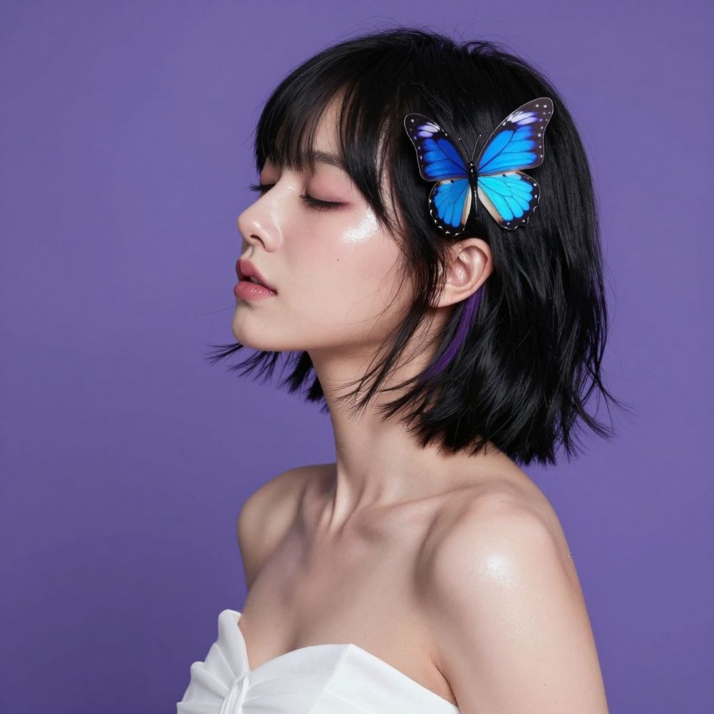 1girl, solo, short hair, black hair, hair ornament, dress, bare shoulders, closed eyes, purple hair, cowboy shot, white dress, from side, lips, strapless, profile, bug, butterfly, strapless dress, purple background, butterfly hair ornament, blue butterfly, kochou shinobu, shiny skin, (mature female), (masterpiece:1.4), (best quality:1.4), closed mouth, ((cute))