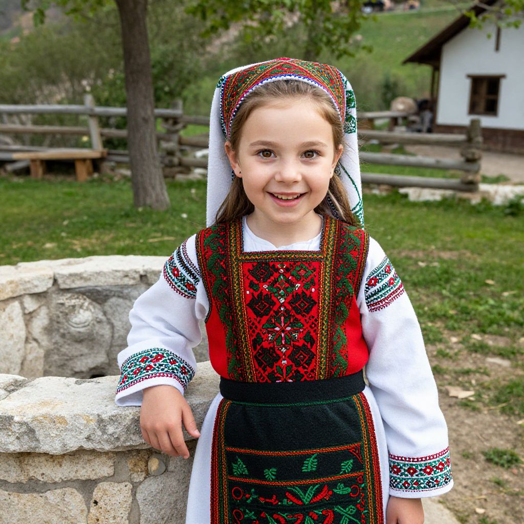A vibrant outdoor scene showing a young girl in a Macedonian folk costume, wearing a bright red and green embroidered dress with a white undershirt and a headpiece made of woven fabric, posing near a stone well in a rural Macedonian village, her face full of joy, with a round, youthful face and bright brown eyes.