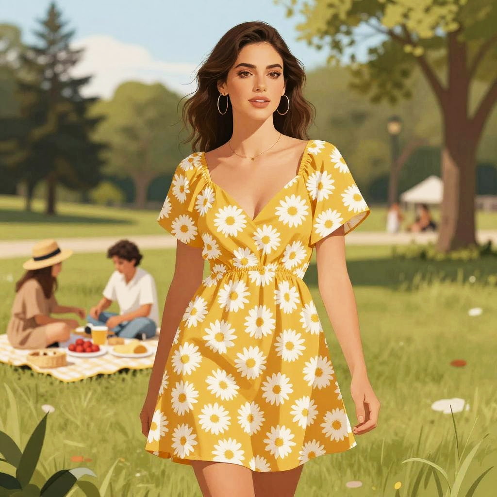 A woman in a casual boho A-line mini dress with a mustard and white daisy print, standing in a scenic park with a picnic area, illustrated in a selfmade hero style. Sexy. Pretty face and beutiful eyes
