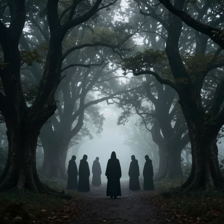 Misty forest arches formed by ancient, gnarled trees bridge a serene path where six cloaked figures stand silhouetted against a luminous backdrop, while a solitary figure walks toward them, creating a hauntingly symmetrical scene of ethereal beauty and mystery.