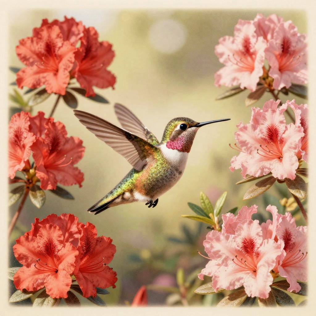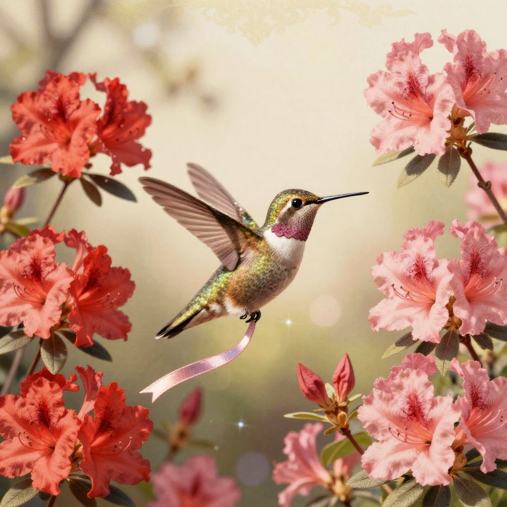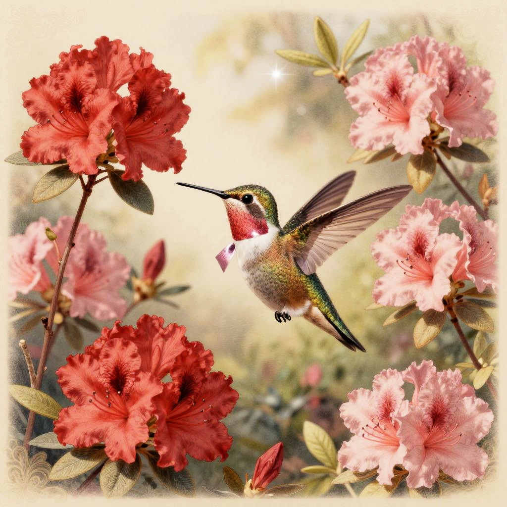 A tiny ruby-throated hummingbird wearing a shimmering silk ribbon tied around its slender neck, set in a lush sunlit garden bursting with red and pink azaleas, vintage illustration aesthetic with delicate linework and fine crosshatching, muted warm palette on a soft cream backdrop, ornate botanical detailing, gentle and charming atmosphere, soft rim lighting, subtle paper grain texture, balanced and symmetrical composition, slight vignette, natural bokeh sparkle, ultra clean edges, high fidelity details