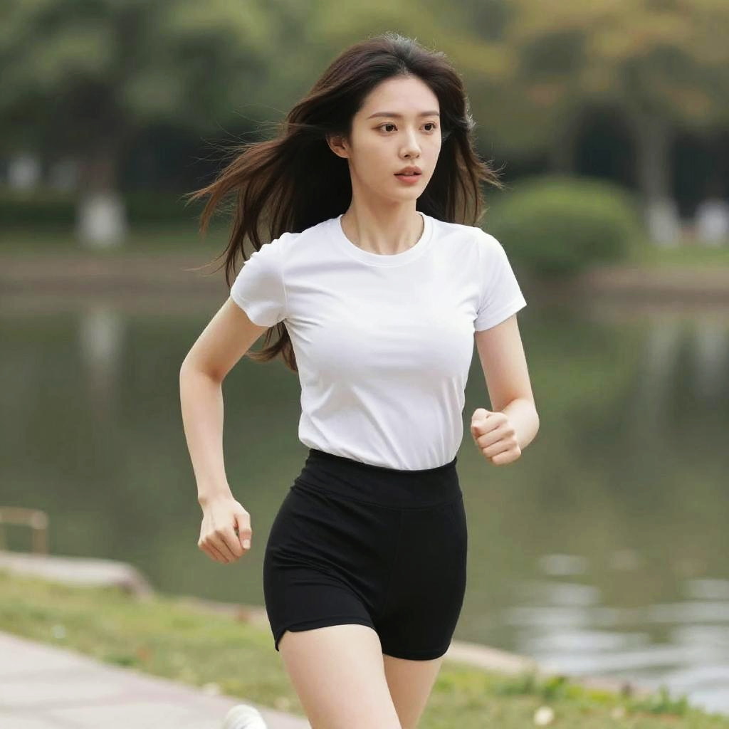 Photorealistic image of a young Asian woman jogging outdoors near a lake in a park. She has long black hair and is wearing a white short-sleeve T-shirt and black high-waisted athletic shorts. The background shows blurred greenery and water, giving a fresh and active atmosphere.