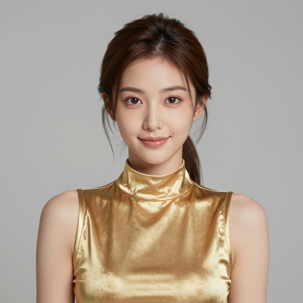 Portrait of an elegant young Asian woman with long flowing black hair and striking blue eyes, wearing a strapless white dress. She poses gracefully against a simple gray background, embodying a modern fantasy queen with delicate and ethereal beauty.