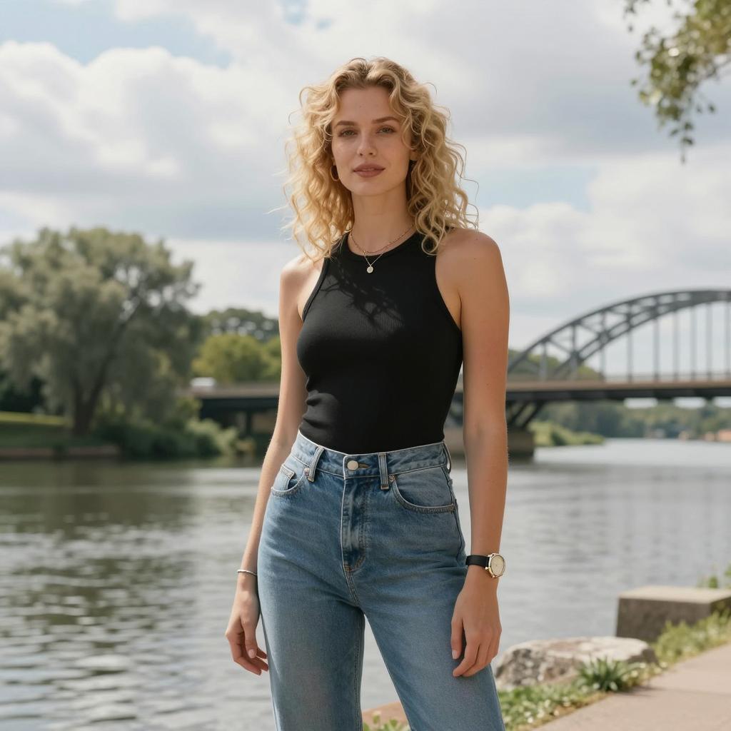 Photorealistic image of a blonde woman with curly hair standing outdoors by a river or lake. She wears a black sleeveless top and high-waisted blue denim jeans, accessorized with a wristwatch, bracelet, and necklace. In the background, there is a steel arch bridge and lush green trees under a partly cloudy sky, suggesting a calm, daytime setting.