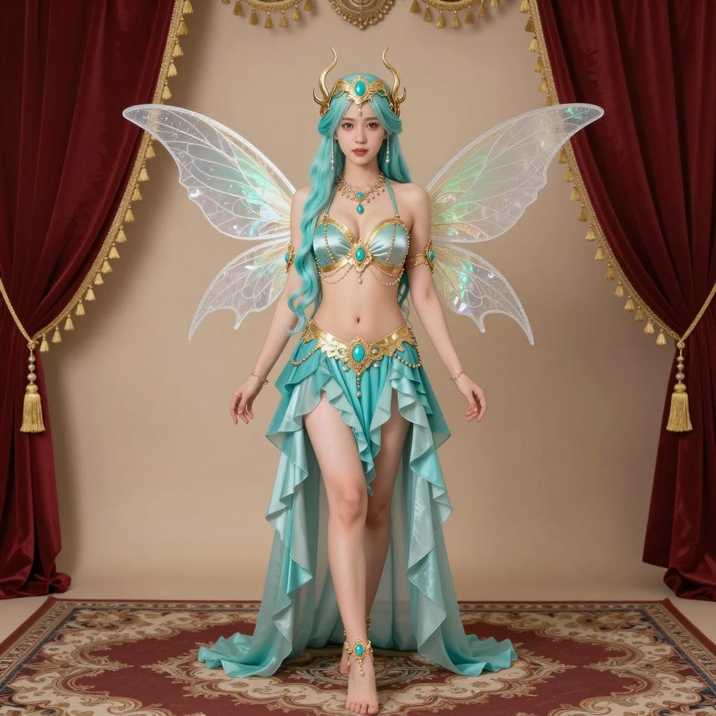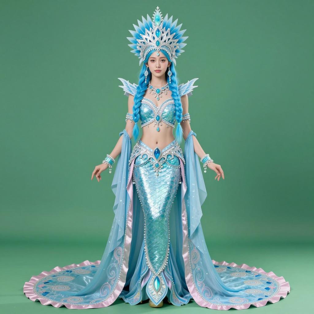 Mermaid festival costume, photograph of a woman, full body, standing, green background, wearing elaborate blue and pink ice queen costume, long flowing dress, intricate pattern, matching headdress with large blue feather-like design, long blue hair, wearing bracelets and arm bands, standing on green floor, green draped background, colorful, fantasy, ethereal, regal, detailed costume, high fashion, bright colors, symmetrical design, ornate, confident pose, formal attire, digital photography style