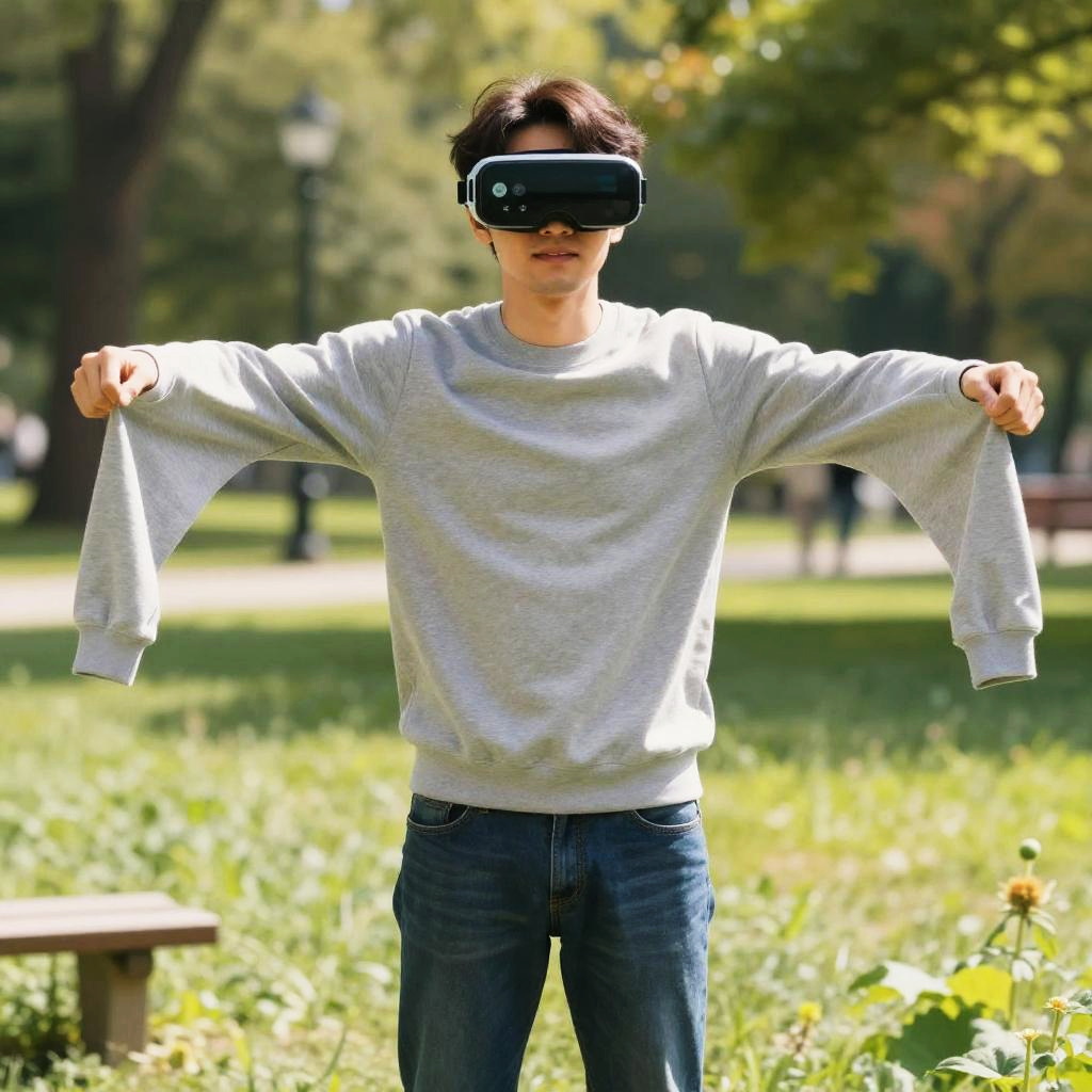 Photograph of a young man in a gray sweatshirt and blue jeans, standing in a sunlit park, wearing VR goggles, holding out sleeves,