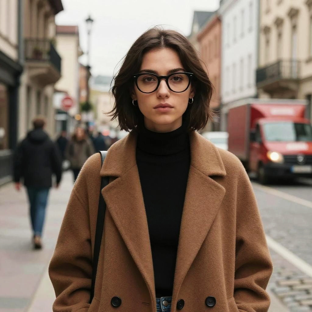 Photograph of a young woman with short, dark brown hair and black-framed glasses, wearing a brown wool coat over a black turtleneck. She stands in a cobblestone street with blurred people and buildings in the background, including a red truck. The sky is overcast, giving a cool, urban atmosphere. She looks directly at the camera with a serious expression.