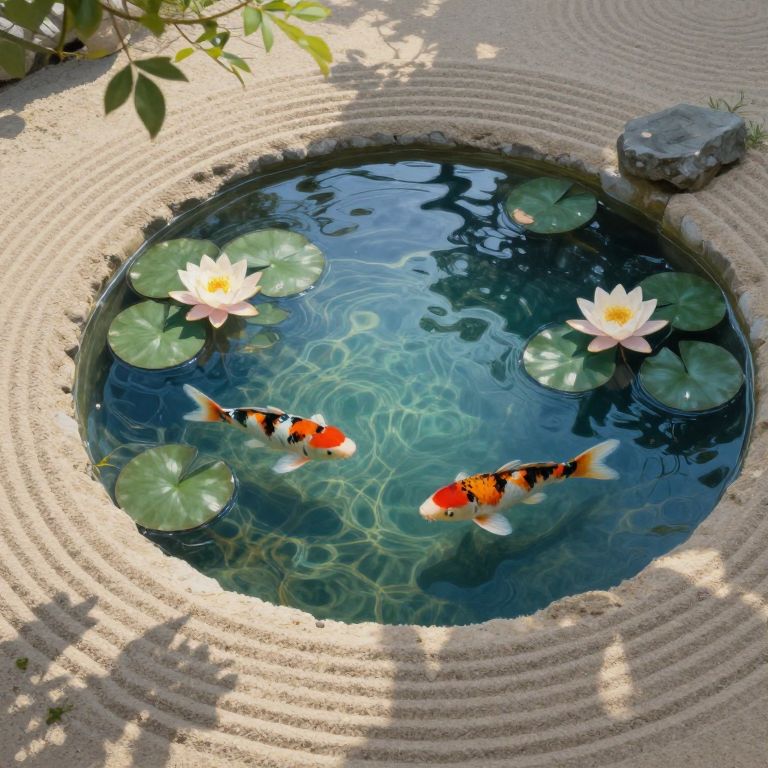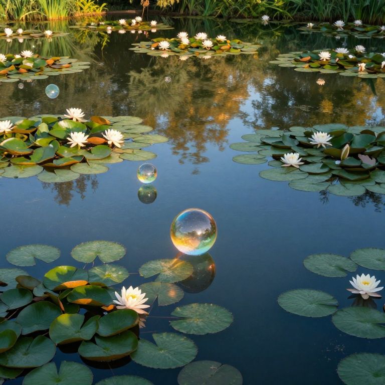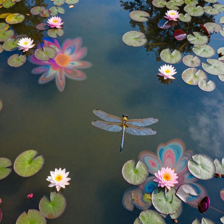 Create an image depicting a tranquil garden setting with lily pads arranged in concentric circles around a central water feature. The fountain at the heart of this scene features geometric shapes flowing downwards, creating an optical illusion where the viewer is unsure whether they are witnessing an upward or downward movement. This intricate design should be rendered from a bird's-eye perspective to emphasize the interplay between reality and perception, evoking feelings of both harmony and confusion within the observer. The overall composition should capture the essence of M.C. Escher's impossible structures without directly referencing his work.