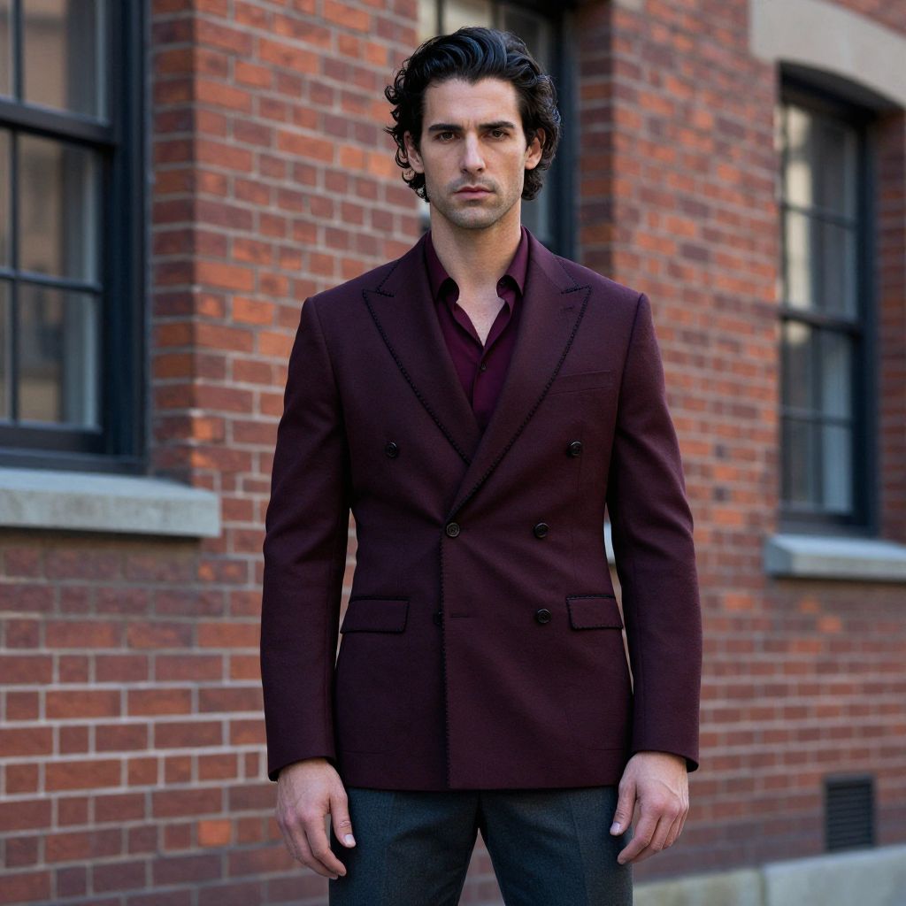 Photograph of a handsome man with dark, wavy hair and light skin, standing in front of a red brick building. He's wearing a dark maroon double-breasted blazer with black trim, over a matching maroon shirt, and dark gray pants. The lighting casts a slight blue tint, highlighting his serious expression. The background features old brickwork and black window frames.