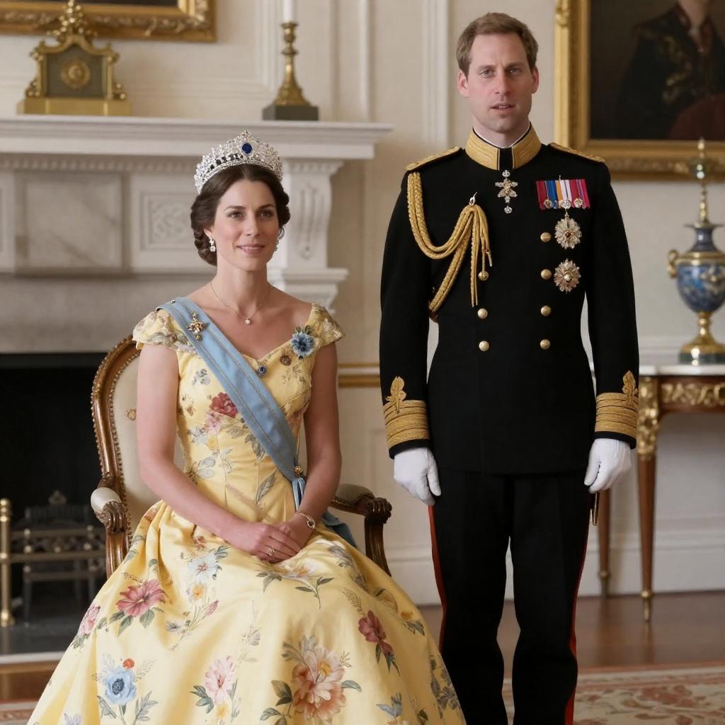 Photograph of a royal couple: a woman in a yellow floral gown with a blue sash and silver tiara, seated on an ornate chair, and a man in a black military uniform with gold stripes and medals, standing beside her. They are in a grand, classical room with a white fireplace in the background.
