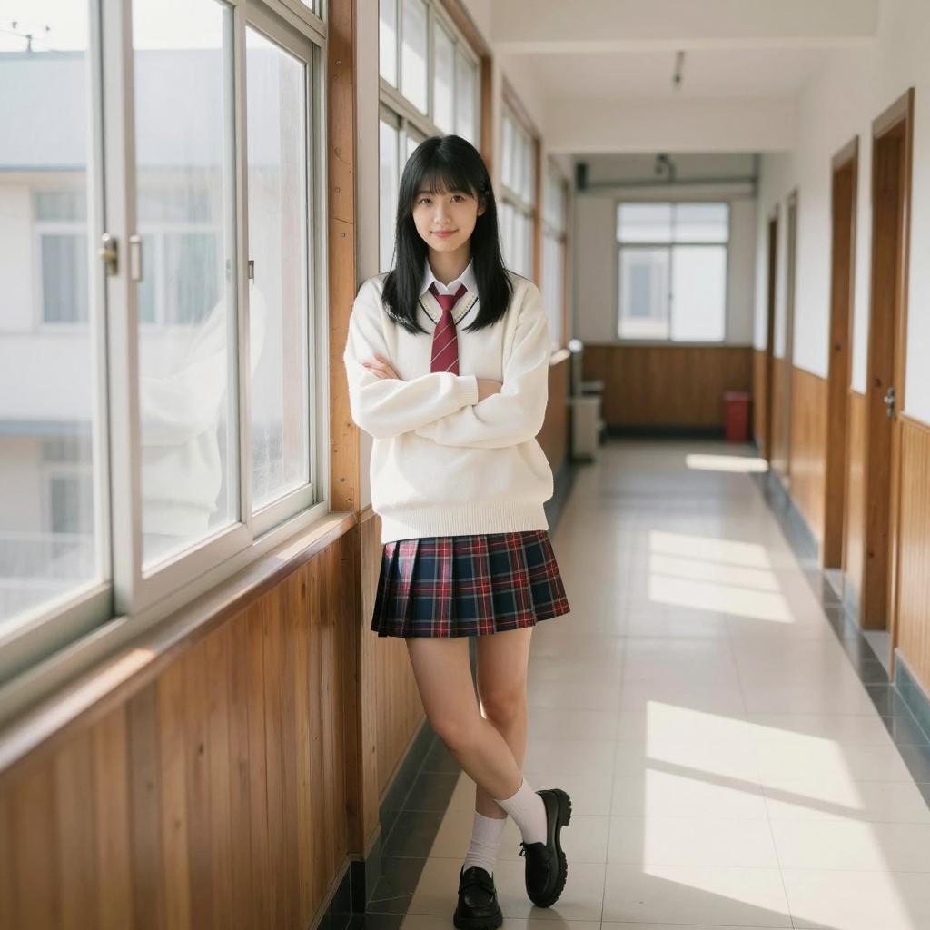 Asian woman standing in a long wooden hallway, leaning against a window. She has straight black hair with bangs, wears a white sweater, red tie, plaid skirt, white socks, and black shoes. She smiles slightly. The hallway has wooden walls, large windows, and a tiled floor. Sunlight streams through the windows. She stands with her arms crossed over her chest.
