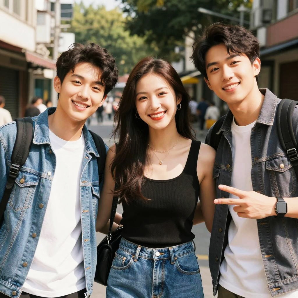 A vibrant group of three young Asian adults posing together on a sunny day in an urban street setting. The two men are wearing denim jackets over white t-shirts with backpacks, while the woman wears a black sleeveless top and high-waisted jeans. They all have warm smiles, with one man making a peace sign.