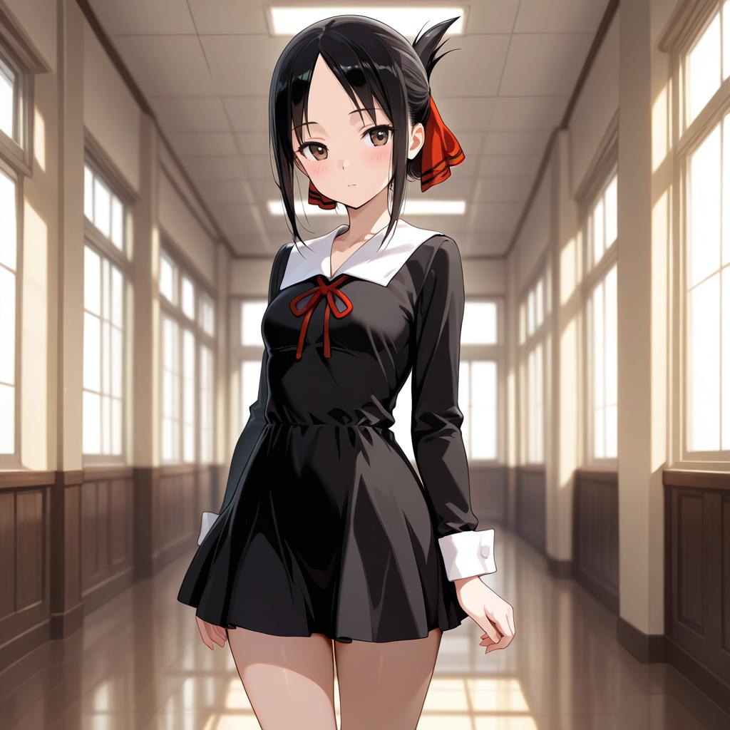 2d, masterpiece, best quality, anime, highly detailed, cowboy shot, 1girl, solo, shinomiya kaguya, red eyes, black hair, hair ribbon, red ribbon, school uniform, short dress, long sleeves, small breasts, standing, indoors, hallway