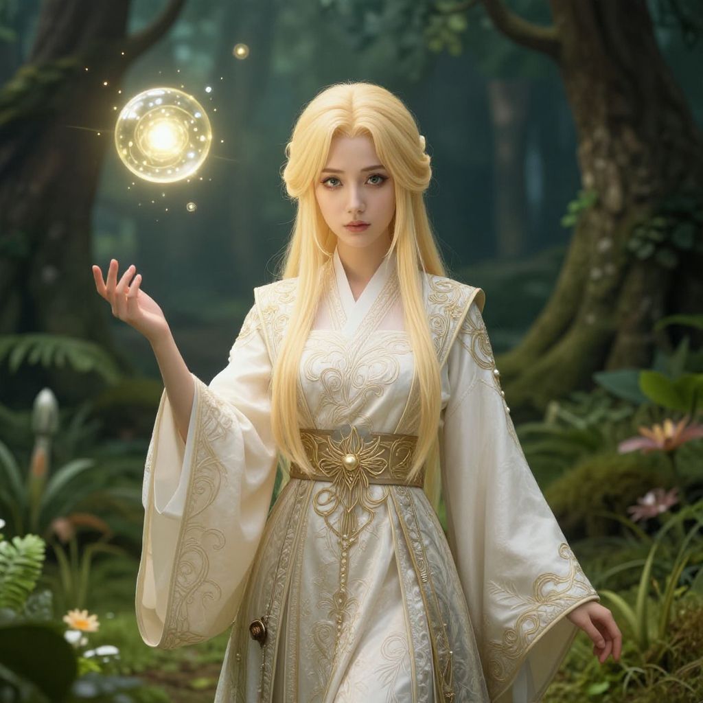 Digital illustration of an elegant woman with blonde hair and blue eyes, dressed in traditional Asian clothing featuring white fabric with gold floral patterns. She wears intricate golden adornments including a decorative crown and long tassel earrings. The woman holds a round hand mirror with a floral design. The background has a soft amber light with a circular window featuring geometric patterns.