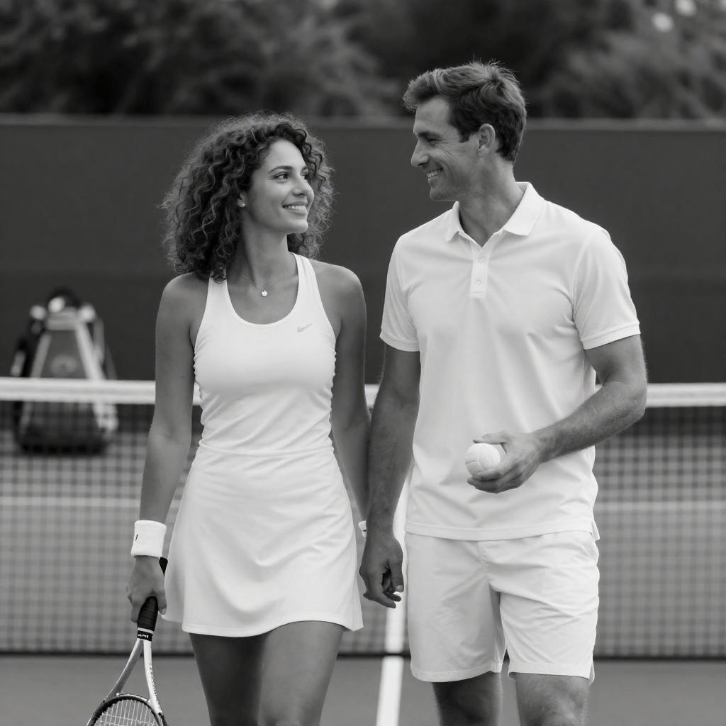 Black-and-white photograph of a smiling couple on a tennis court. The woman, with curly hair, wears a white tennis dress and holds a racket. The man, in a white polo shirt and shorts, holds a tennis ball. Background includes a tennis bag and foliage. The woman stands slightly in front of the man, who is looking at her.