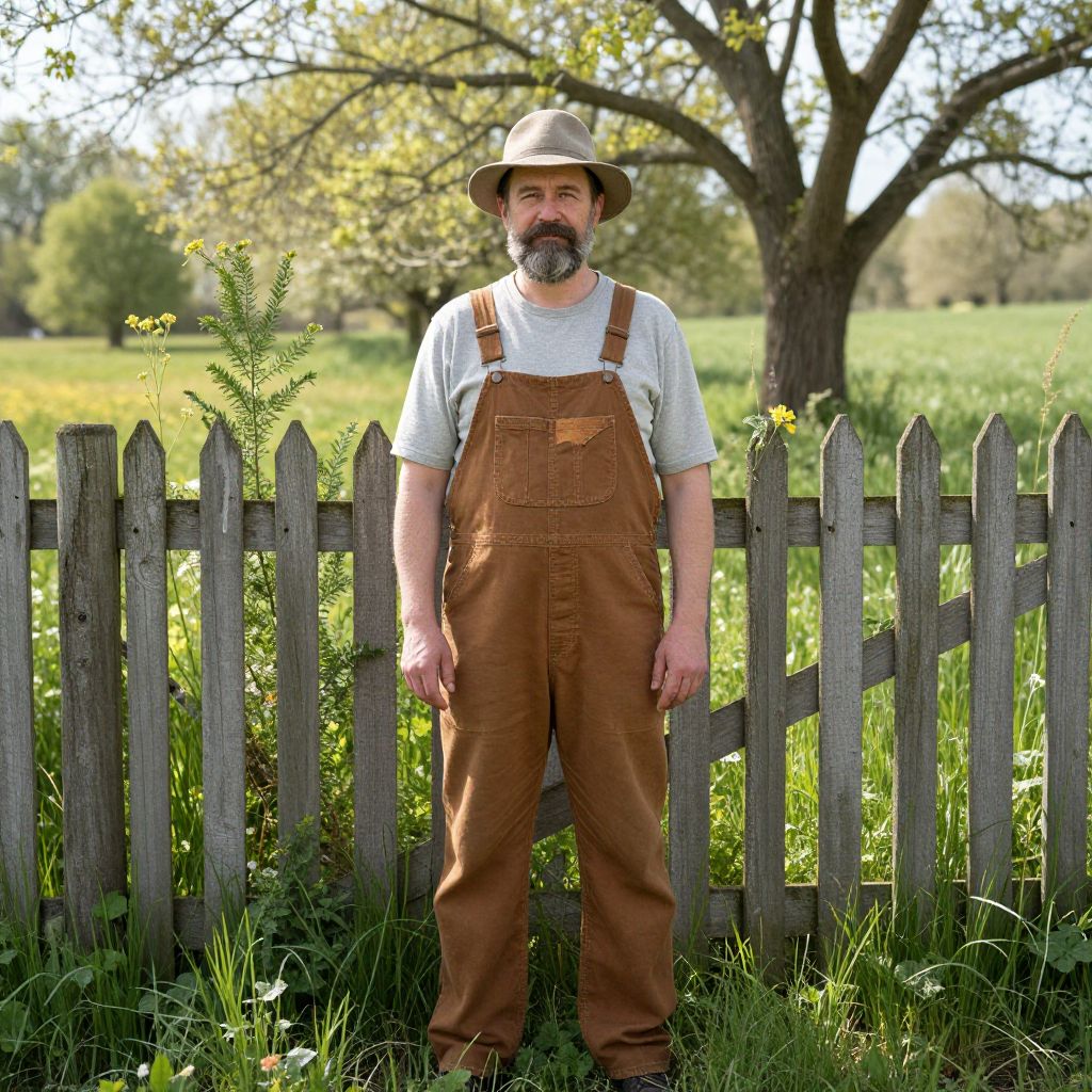 A middle-aged man with a full beard and a well-groomed mustache stands confidently in front of a wooden fence. He is wearing a classic brown overalls with a slightly worn patch on the pocket and a soft beige hat tilted slightly to one side. The fence is weathered and surrounded by lush green plants growing behind him, including tall grasses, wildflowers, and small shrubs. The scene is set in a rural countryside during early spring, with soft sunlight filtering through the trees, casting gentle shadows. The atmosphere is peaceful and nostalgic, emphasizing a sense of quiet simplicity and grounded presence.