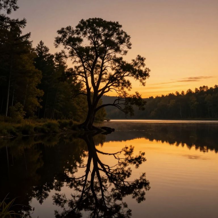 A mesmerizing landscape captures a serene lake at dusk, its tranquil waters reflecting an ancient tree with deep, mysterious shadows. The warm golden hues of the setting sun paint the sky in rich gradients, mirroring the earthy tones of the surrounding forest. This captivating scene melds dreamlike aesthetics reminiscent of Stålenhag's art with surrealist elements that evoke Magritte's \"The Treachery of Images,\" inviting viewers to explore the hidden depths of nature's beauty and mystery through an alluring atmosphere that balances peace and intrigue.