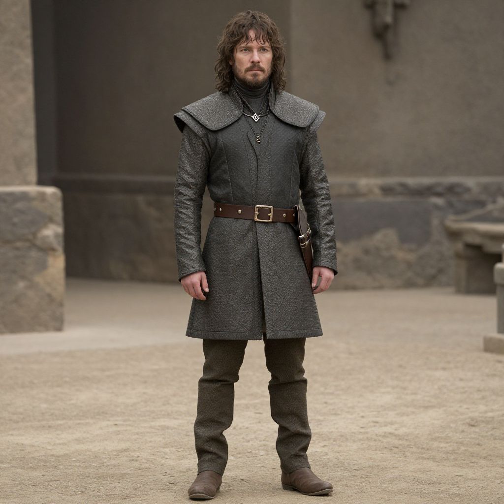 Photograph of a man standing outdoors in bright sunlight, wearing a dark hooded cloak with a cross necklace, a gray tunic, black pants, and boots. He has a gray beard and black gloves. The background shows a sunlit path with trees and blurred figures. The man's serious expression and dark attire give him a mysterious, almost medieval appearance.
